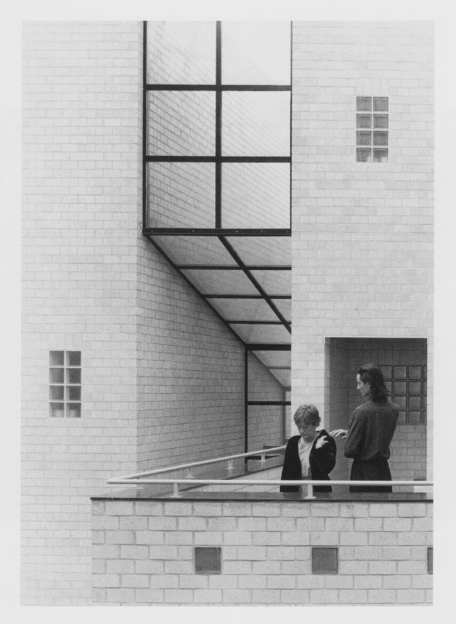 Fried Mertens en David Haneke in de foyer, verbouwd door Charles Vandenhove met wandschildering van Sol Lewitt