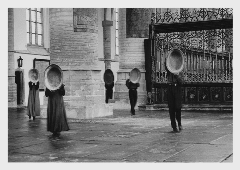 Terwijl een ondoorgrondelijk diepe, langzaam aanzwellende orgelklanken-stroom de ruimte vult, wenden de torso’s in het transept zich onzichtbaar langzaam naar het orgel.
