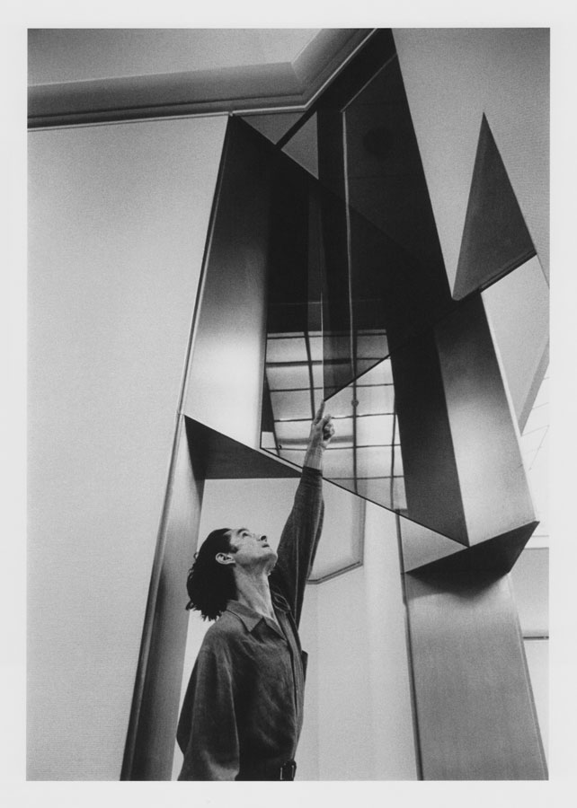 Fried Mertens op het snijpunt van drie zalen; daar waar twee afgeschuinde hoeken van de kleine zalen door Quist ‘geopend’ zijn en verbonden met de grote zaal; de oorspronkelijke afschuining blijft in het hoge, verschuifbare, glas bewaard