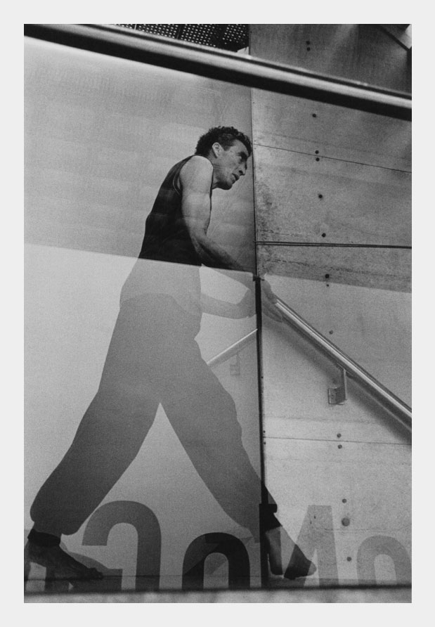 de glazen borstwering van het trappen-huis weerspiegelt (G)o No Go, de tentoonstelling van Ad van Denderen
